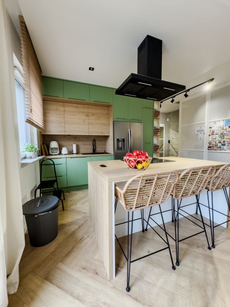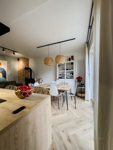 Centralnym punktem strefy dziennej jest przestronny salon z aneksem kuchennym oraz nowoczesną kozą, która nadaje wnętrzu wyjątkowego charakteru i tworzy niepowtarzalny klimat w chłodniejsze wieczory. Duże przeszklenia prowadzą bezpośrednio na taras i do prywatnego ogrodu.